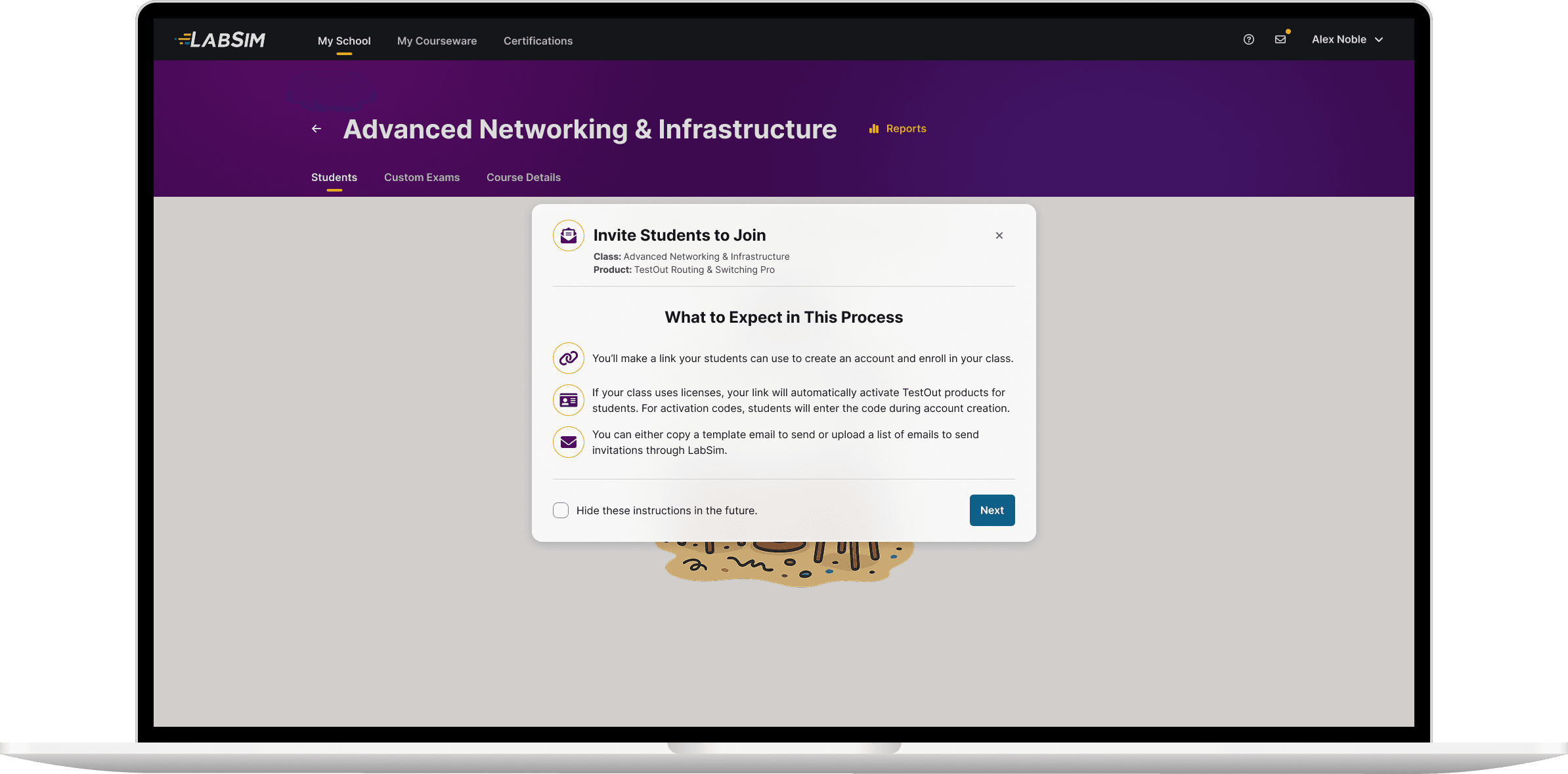 For students to access to their LabSim courseware on the first day of class, teachers needed to complete two tasks: