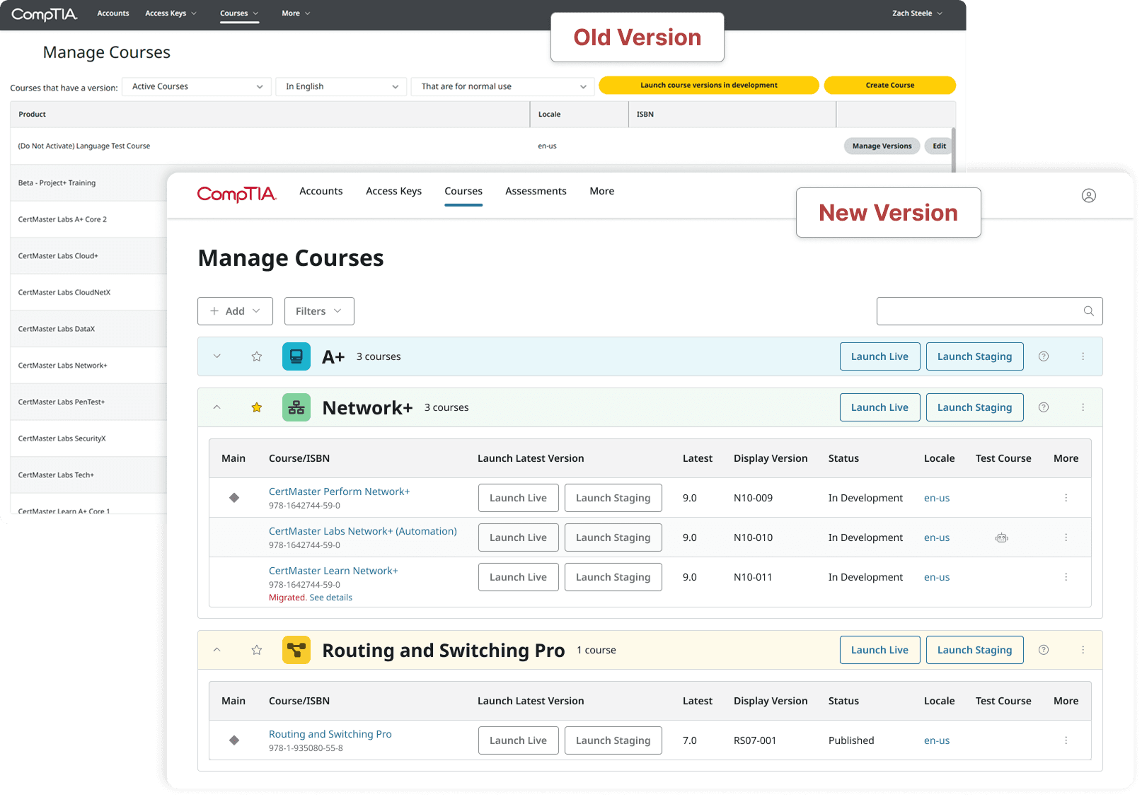 After CompTIA purchased TestOut, the product team needed to revamp TestOut’s LabSim learning platform into CompTIA’s CertMaster platform, allowing CompTIA to host all of their courses in-house, freeing them from reliance on third-party hosting platforms. This required unifying two divergent course organization structures by updating and redesigning our internal course management system.