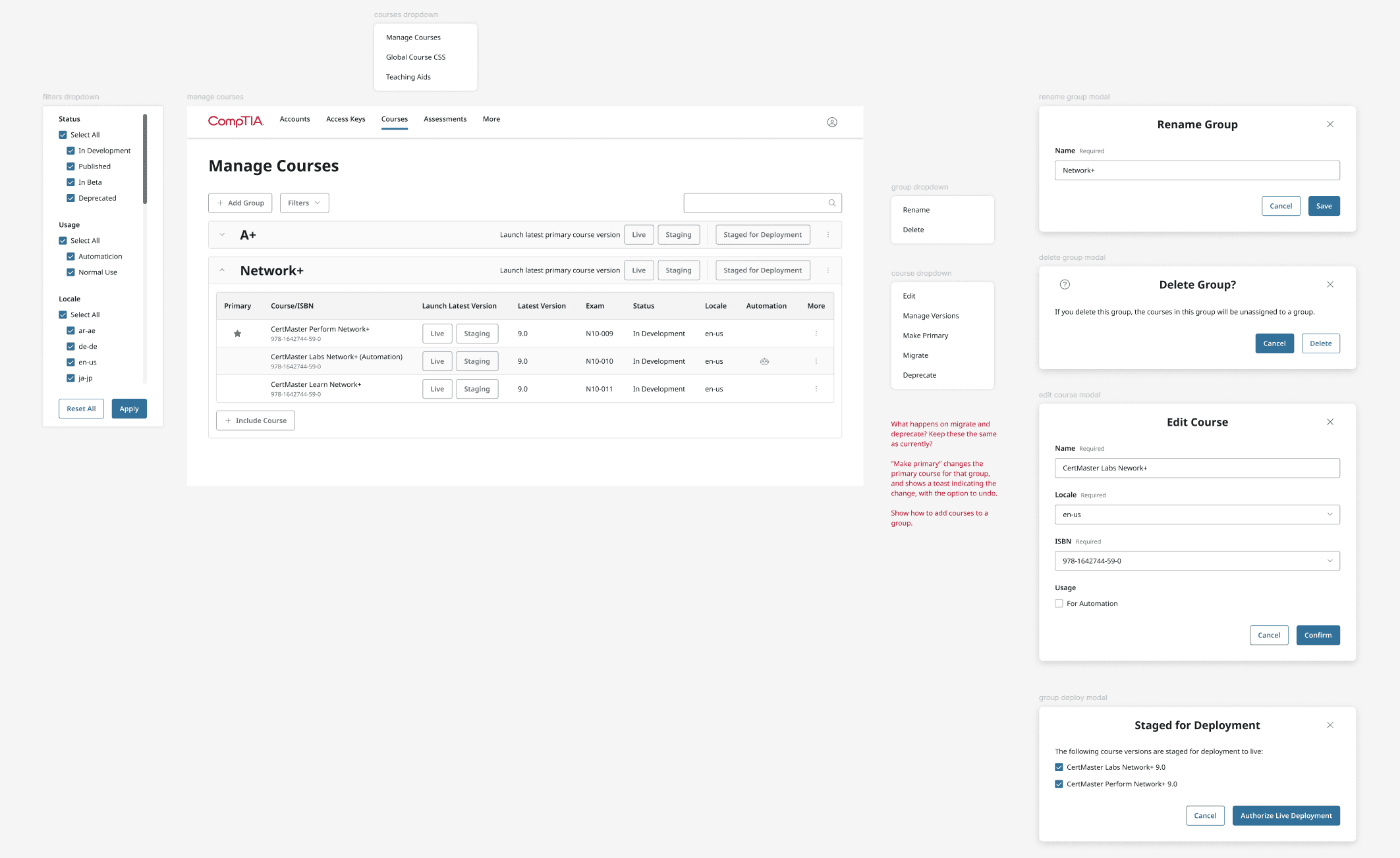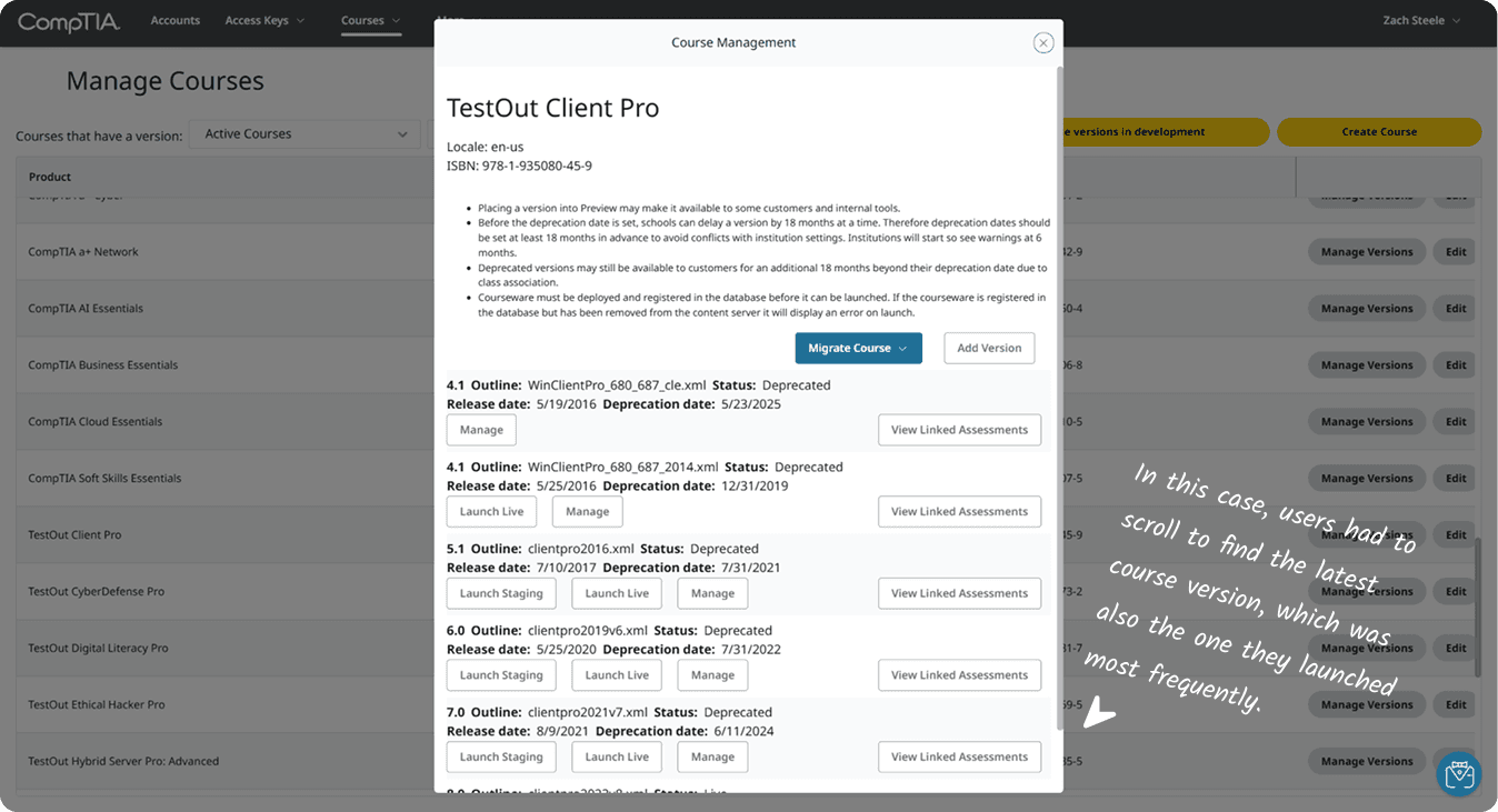 Through user research and collaboration with Engineering and Course Development, I redesigned the Manage Courses information architecture to unify CompTIA’s and TestOut’s disparate course organization structures in a way that provided flexibility for future growth. I also improved the course development workflow efficiency by an estimated 40%. Together, these efforts supported roughly $9M in annual impact by eliminating third-party hosting costs and enabling a 2X increase in year-over-year course production.