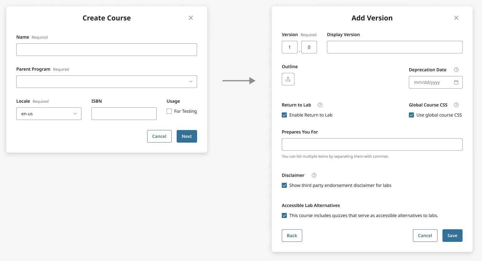 I combined the separate flows into a two-step wizard, making the course + version creation process a one-stop shop.