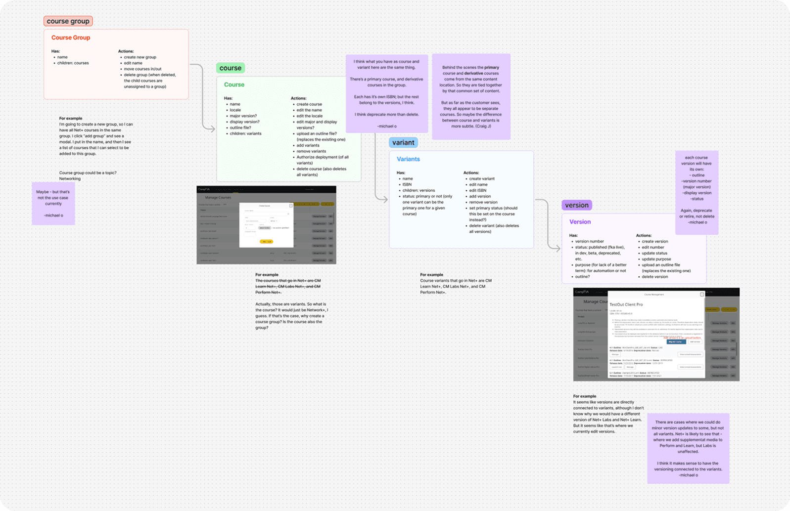 Unifying TestOut's and CompTIA's disparate course organization structures required a significant change to the underlying information architecture. I charted the proposed changes, and collaborated with Engineering and Course Development, iterating until we had a solid solution.