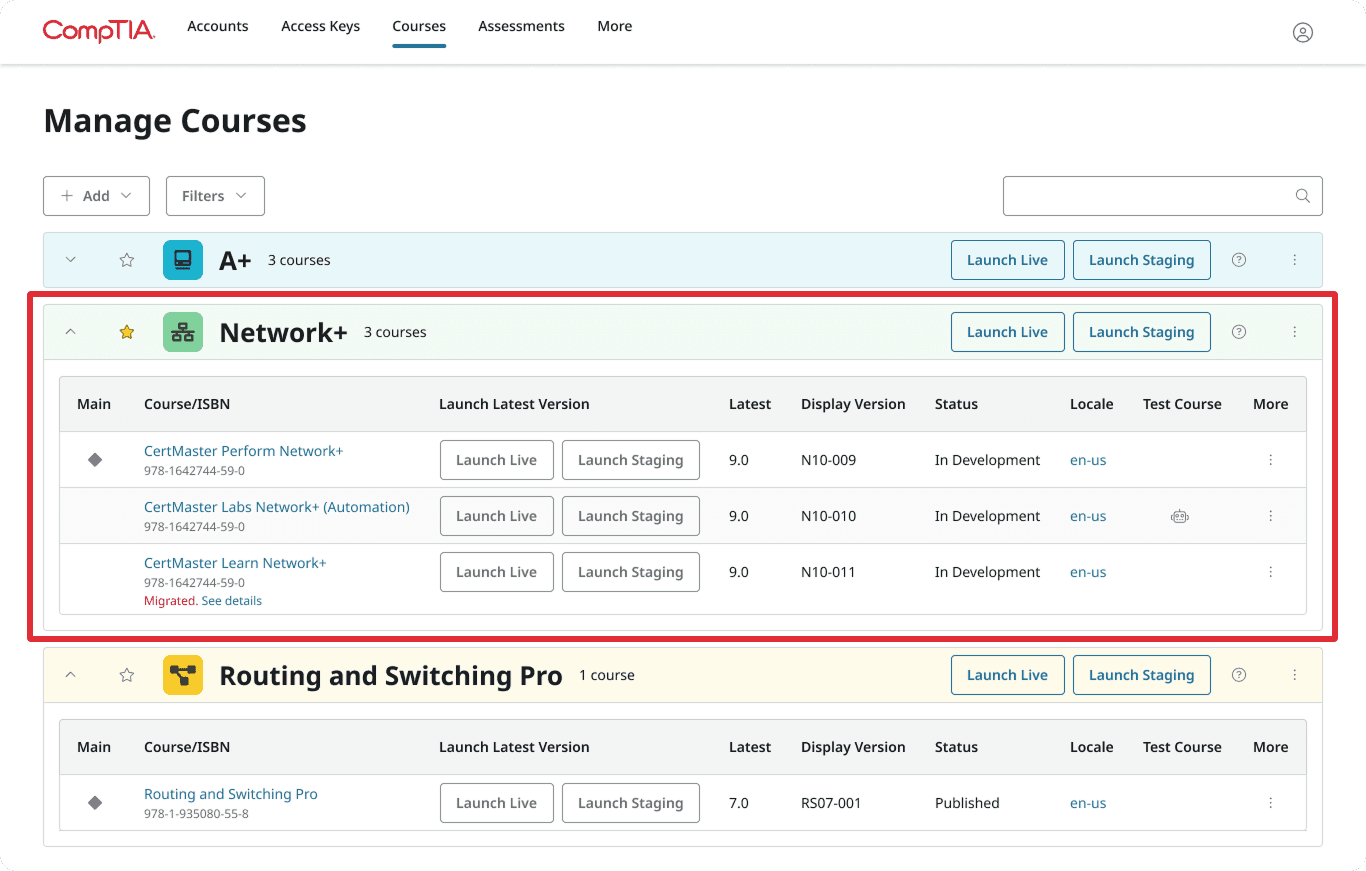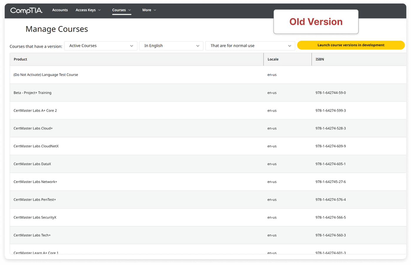 TestOut’s structure was a simple alphabetized list. CompTIA’s more complex approach involved groupings of related courses. CompTIA’s naming convention, when inserted into TestOut’s alphabetical listing, resulted in related courses not showing near each other.